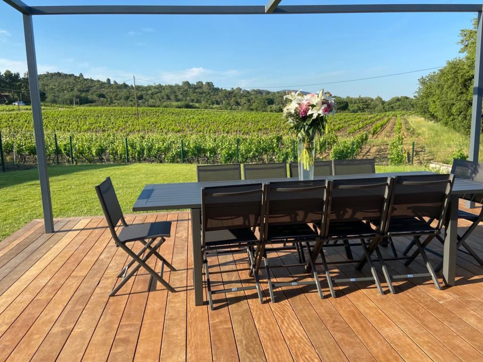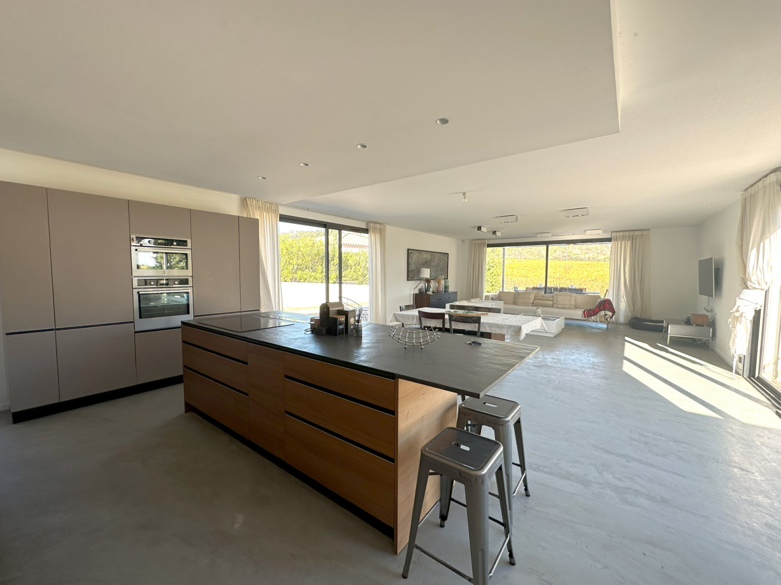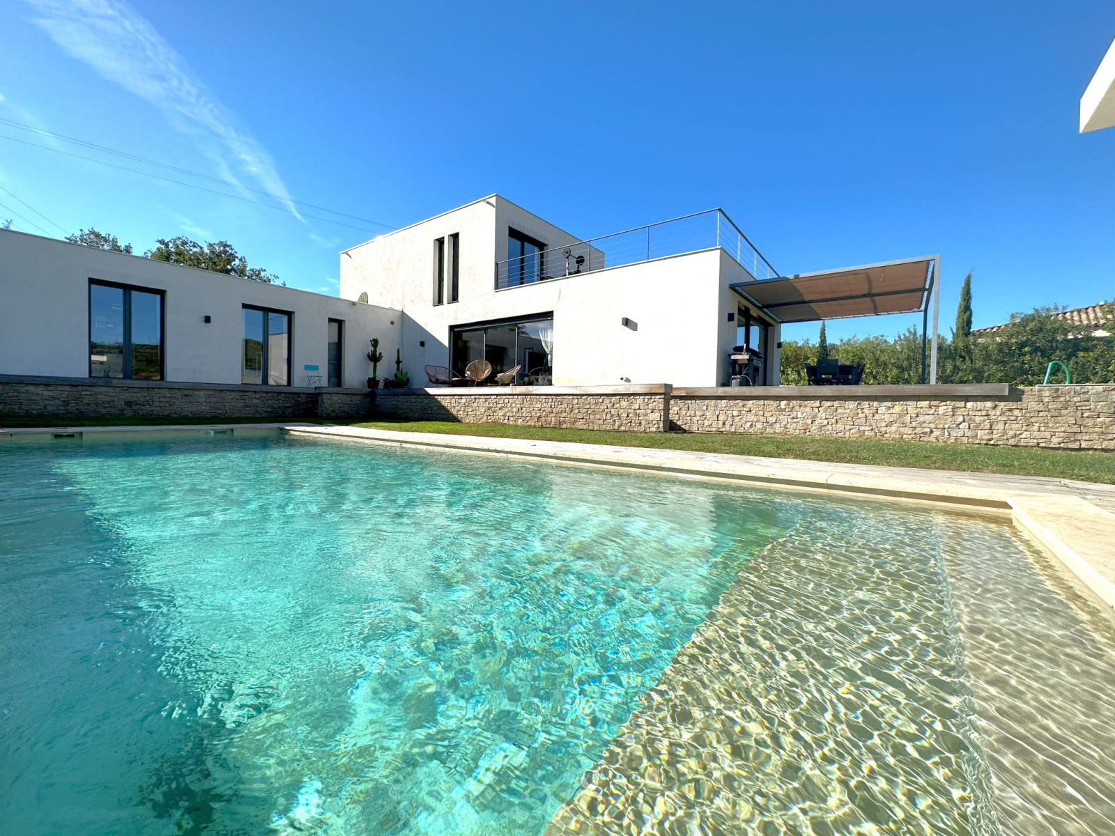 Entre le village de Grimaud et Cogolin, maison récente de style contemporain de 240 m² située au calme avec vue imprenable sur les vignes et le château de Grimaud. Sur un terrain plat de 2000 m² cette villa se compose au rez-de-chaussée d'une entrée, d'une grande pièce à vivre lumineuse avec cuisine ouverte, d'une buanderie, d'un garage et de 3 chambres avec chacune leur salle d'eau.À l'étage, se trouve une chambre de maître, avec salle d'eau, dressing, wc et une grande terrasse.Piscine, pool house, nombreuses terrasses et une piste de boules.